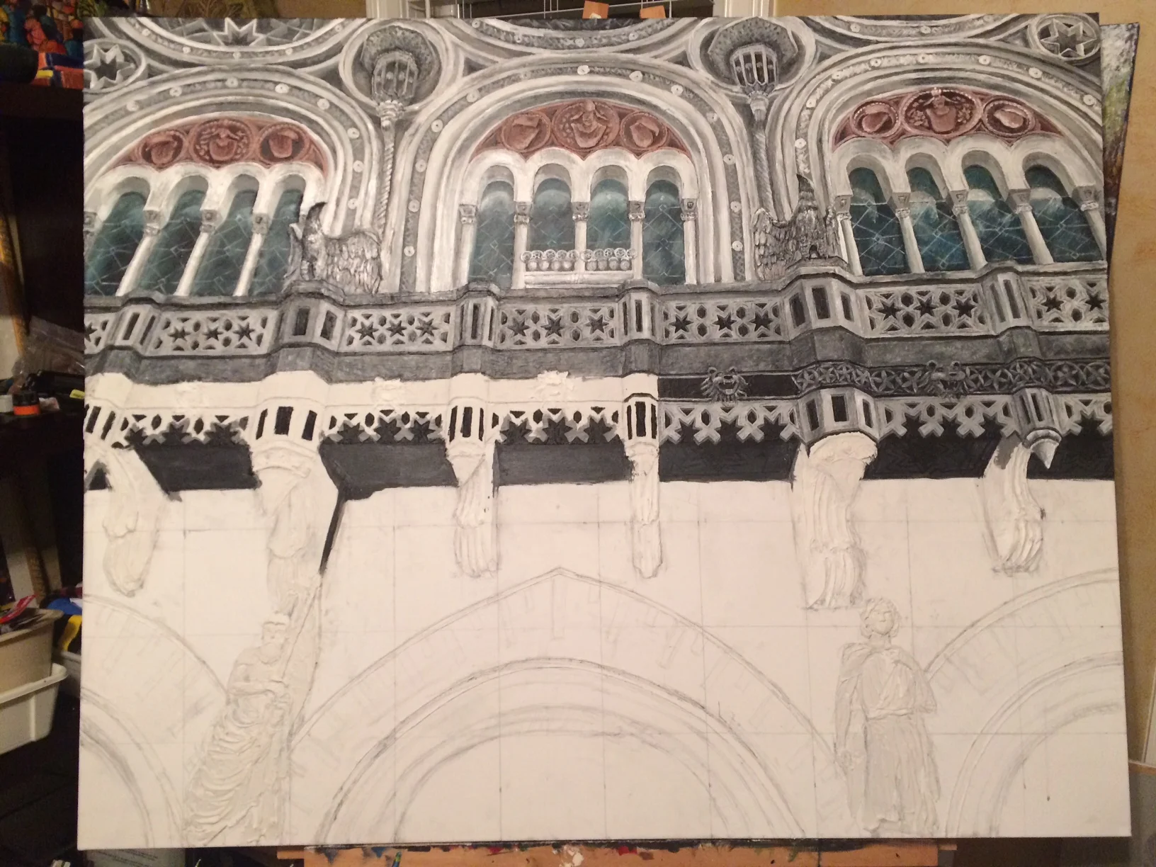 The detail on this building is beautiful! Look on the right side of the painting where the detail is complete and the illusion of depth. I feel this painting does not need to be hung out of hands reach. It needs to be touched and experienced.