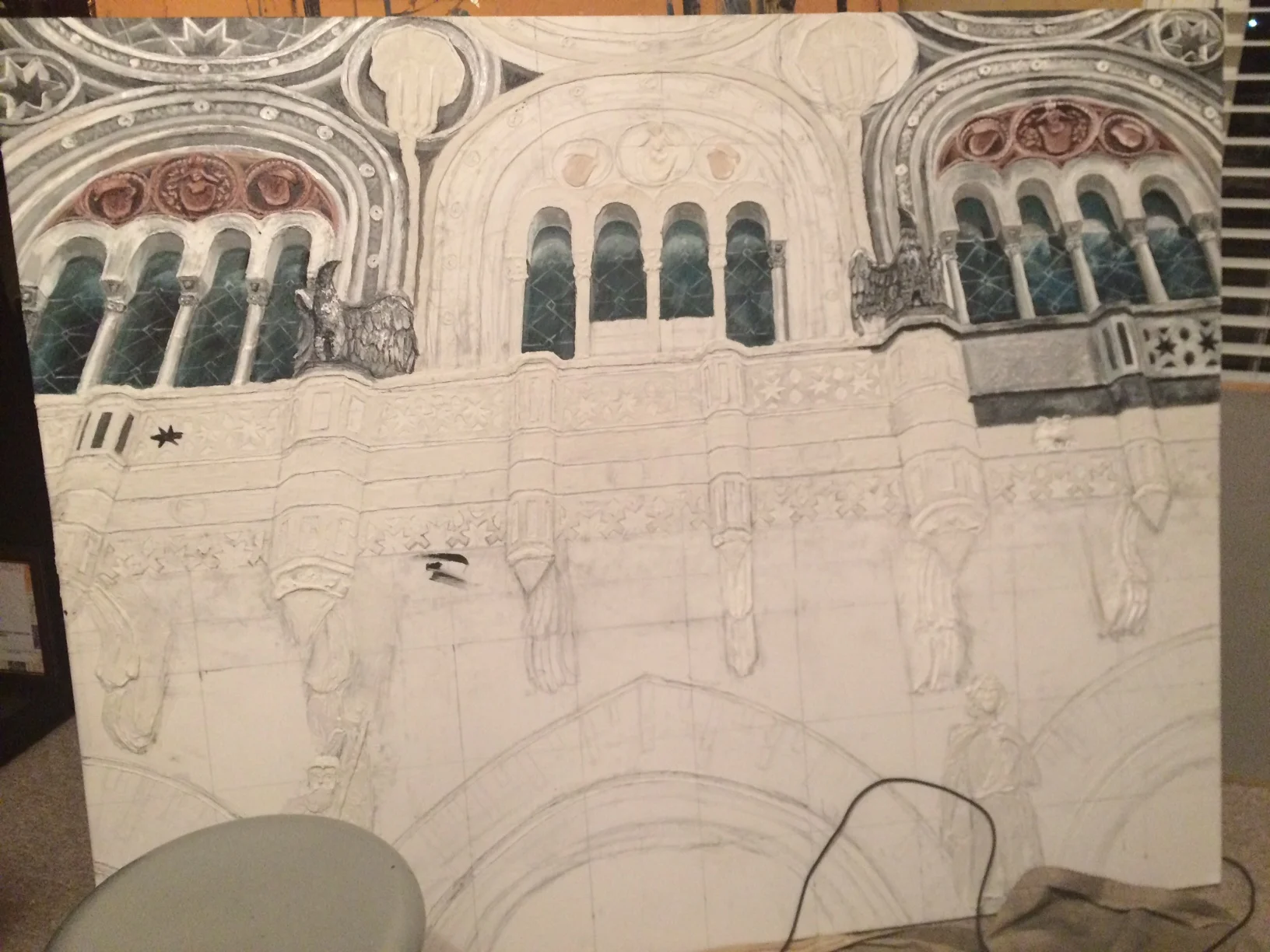 This is a very rough sketch to be modified and must finish perfect... Such a large format can be unforgiving. Definitely have to recheck all measurements and perspective before I lay down any modeling paste or paint. I can see which sculptural elements I would like to develop at this point. Break time!